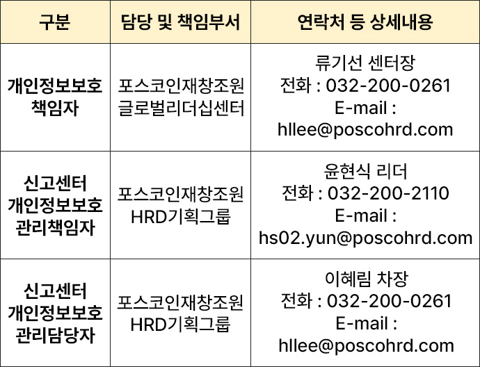 회사는 이용자께서 포스코인재창조원 홈페이지(www.poscohrd.com) 의 사이버신고센터에서 개인정보 수집 내용에 대해 「동의함」 버튼 또는 「동의하지 않음」 버튼을 클릭할 수 있는 절차를 마련하여,「동의함」 버튼을 클릭하면 개인정보 수집에 대해 동의한 것으로 간주합니다. .